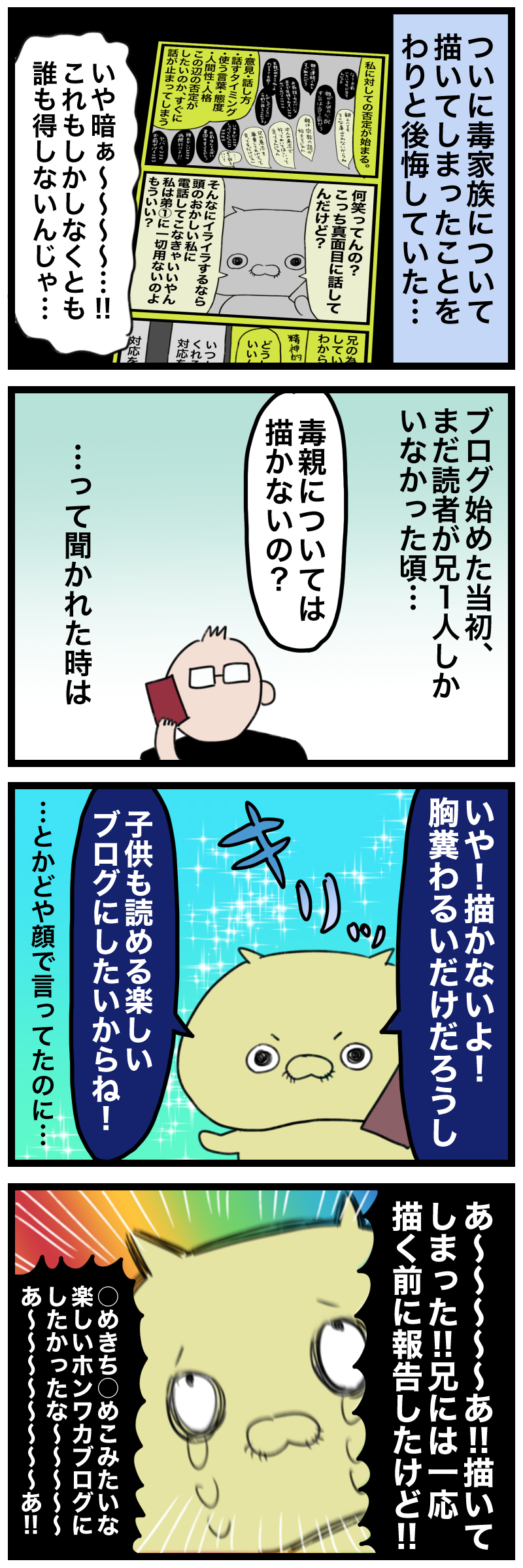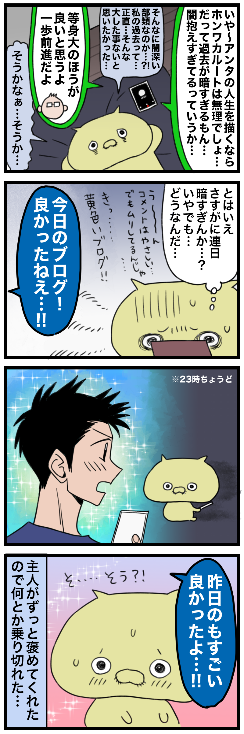 ここ最近のブログの方向性と内なる葛藤の話 2023年09月22日 23:00 主人が毎日のように褒めてくれたのが意外でしたね…ありがたかったというかまだ熱心に読んでくれてたのも意外というか…やっぱり嬉しいね…ありがとう主人でも飽きたら読むのやめてもええのよ!ボーイは飽きたのか最近全く読まなくなったよ!笑あと閲覧数が通常回よりも若干伸びていたので心配かけてしまったんだなぁ…とごめんね……出来る限り自分を被害者っぽく描かないように気をつけたつもりだったんだけどいざ描く側となると、なかなか扱いが難しく、そして読者を不快にさせやすい闇の深いテーマよな食パンとカフェオレわろた…コメント&エア差し入れありがとう!!❤️ 投票ボタンInstagram開設したよ! 「⚫︎めとうさん」カテゴリの最新記事 タグ :#毒家族#ブログの話#主人#兄 < 前の記事次の記事 > コメント コメント一覧 (3) 1. ななし 2023年09月23日 00:05 不快にさせやすい闇のテーマだったのかもしれませんけど 同じ悩みを持っ人には道しるべになるとも思いますよ でっかいホコホコパンとコーヒーとジャムで にっこりめとうさんの表情尊いが過ぎませんか???? ヮァ………ヵヮィィ……😭 0 めとう がしました 2. チップママ 2023年09月23日 11:13 闇だけでなく、平和な日常やちょっとしたハプニングなど織り交ぜてあるから、いろんな想いで興味深く読んでます♪闇も嫌じゃないよ🙂 ちなみに、このブログを知ったきっかけはスズメバチのお話。我が家の庭に作ろうと毎日下見に来てるのに困って検索したら運命的に出会いました😚 0 めとう がしました 3. ななし 2023年09月23日 19:21 19日のブログの三番目にコメントした者です。 差し出がましいことを書いてしまったかな…と反省しておりました。 めとうさんの幸せを心から願っています。 暗い話も書くことで気持ちが整理できたり、第三者の助言も貰えたりするので書きたい時は書いちゃいましょう😄 0 めとう がしました コメントフォーム 名前 コメント 記事の評価 リセット リセット 顔 星 情報を記憶 コメントを投稿する