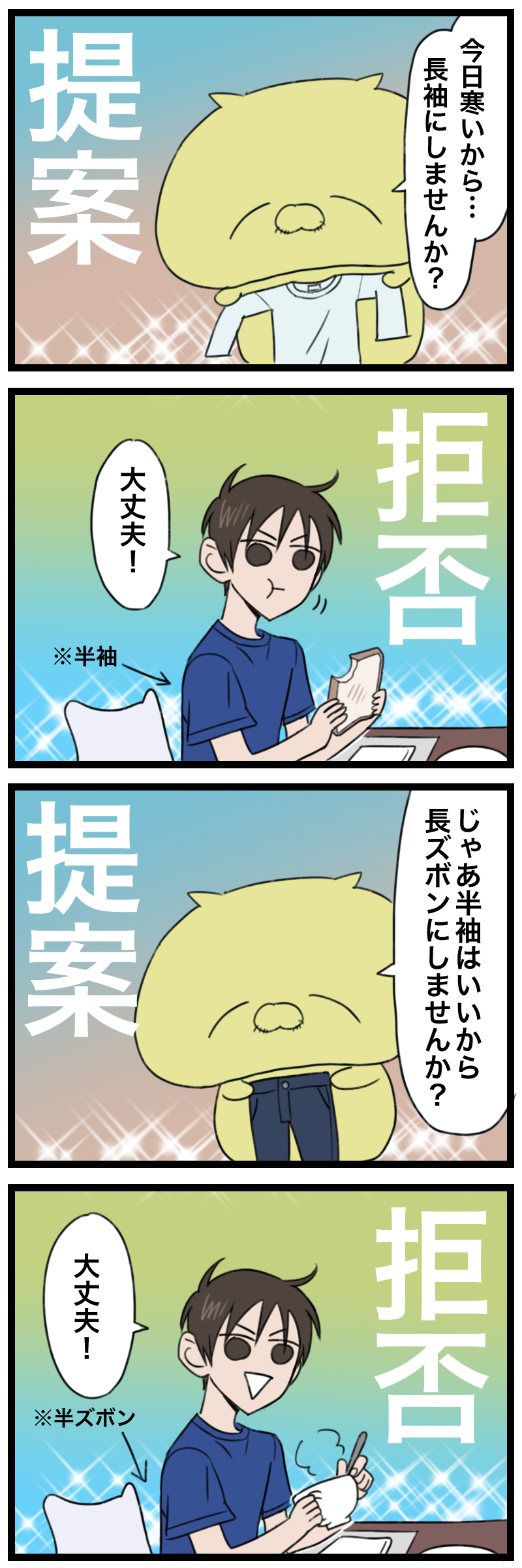 季節の変わり目に巻き起こる寒がりと暑がりの攻防 2023年10月20日 23:02 最近毎朝これ貴重なご意見コメントたくさんありがとうございます!パパさんからもコメント来てて色んな声が聞けるの嬉しい…1つ1つに返信できなくてごめんなさいね…育児ってむずいよ 頑張りすぎず頑張っていきましょうねここ見て元気出してくれ〜〜〜〜〜!!!!!LINE通知サービス?が今年いっぱいで終わるみたいなのでライブドア公式アプリ?のほうに登録お願いします投票ボタンX( 旧Twitter )Instagram 「⚫︎日常回」カテゴリの最新記事 タグ :#服#季節#ボーイ#秋 < 前の記事次の記事 > コメント コメント一覧 (5) 1. 肉美 2023年10月20日 23:09 大丈夫〜〜あぁぁぁぁぁああぁ 子供は風の子ってことですね!! (風邪をひかないわけではないので一枚着せたい) 0 めとう がしました 2. ななし 2023年10月21日 00:13 絶対長袖vs絶対半袖 ファイッ!!! 大人と子供では体感温度も違いますからねぇ… 大人ですら年中薄手ヤロウもいますし! 特に今の時期はどっちを着るか(着させるか)難しいですよね 寒さに震え青マントブラケット姿のめとうさん🤤🤤 0 めとう がしました 3. ななし 2023年10月21日 12:14 ………大事な事を書き忘れてしまい申し訳無いです 推し記事&ランキング50インおめでとうございます!!!🎉 公式化したら1/1スケールのめとうさんぬいぐるみを!是非偉い人!!! 0 めとう がしました 4. あちゃ 2023年10月21日 12:48 私自身暑がりで未だ半袖で元気に通勤&仕事をしております🤣 もっと寒くなってくれば自発的に上着もきてくれますよ(*^^*) 0 めとう がしました 5. チップママ 2023年10月21日 18:03 ボーイ君わかりすぎる😆子どもって大人より動き回るせいか寒いの平気ですよね。 子どもの同級生で真冬でも半袖半ズボンの男子いました🥶お母さん諦めてましたw うちの息子も、寒かろうとコートを無理矢理着させて登校させたところ、公園かどこかに脱ぎ捨てて忘れてきてしまい、探しに行くも見つからず。買ったばかりのちょい高いやつで泣きました(´༎ຶོρ༎ຶོ`) 0 めとう がしました コメントフォーム 名前 コメント 記事の評価 リセット リセット 顔 星 情報を記憶 コメントを投稿する