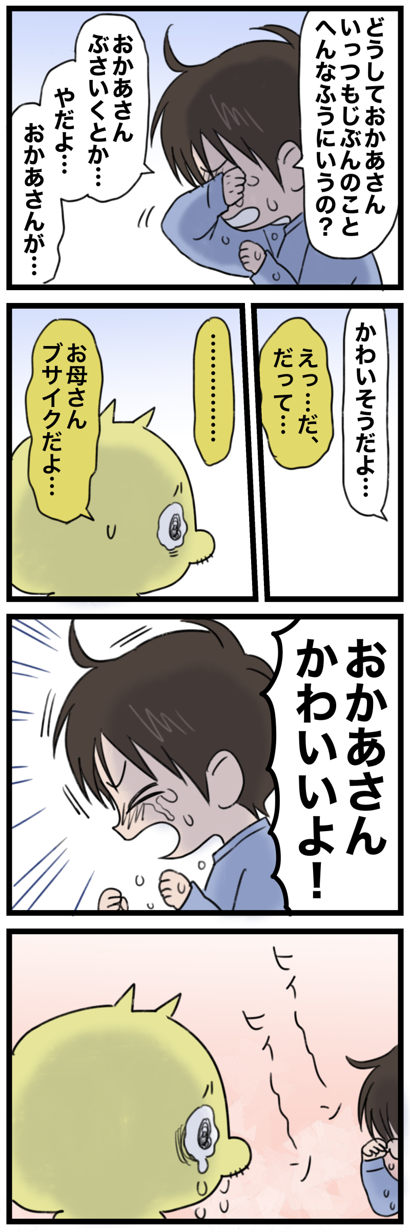 自虐ばかりの自分を変えてくれた恩人の話③ 2023年11月11日 23:01 これ描いてる時、思い出して泣いちゃって困った続くプップクピー!やんわりコメ返🐥コメントも優しくて泣いてしまうんだが…!!!!!ありがとうね…!!!!!!!!!!!!!!!ボーイには教えてもらってばかり…無条件の愛まさにそれ…!!!!!子供の無条件の愛は衝撃だった投票ボタンX( 旧Twitter )Instagram 「⚫︎めとうさん」カテゴリの最新記事 タグ :#ボーイ#毒家族#過去の話 < 前の記事次の記事 > コメント コメント一覧 (4) 1. ななし 2023年11月11日 23:35 幼い時分から家族とはいえ他の人に寄り添って 自分の事のように心を痛めて涙を流せるなんて 大人でもそうそう居ないのに…… 大天使ボーイ君😭 0 めとう がしました 2. 子育て親育ち 2023年11月12日 00:00 「子は親の鏡」 めとうさん自身が人の心に寄り添える人だからこそ ボーイも “心” を守れる子になったのでしょうね 褒め言葉は心の栄養 たくさん褒め合って大きく育てたいですね✨🌱✨ 0 めとう がしました 3. チップママ 2023年11月12日 10:07 天使なボーイ君…ホロリときました🥹子どもの心からの言葉って、本当に胸に沁みますよね。形のない一生の宝物ですね。文字通り人生も変えてくれるし学びも与えてくれますね。優しいボーイ君、ご主人も含め、めとうさん一家は本当に素敵な家族💕 ちなみに…息子が小さい時、TVのCMを見てて、「あ!!このひとママに似てる!そっくり」と見るたび騒いでたのは井◯遥さんだったのですが、もちろん全く似てない。でも私だけの嬉しい思い出です🤣私事ごめんなさい🙏 0 めとう がしました 4. ポロンコ・ポロン 2023年11月12日 17:39 (´;Д;`) (´;Д;`) (´;Д;`) (´;Д;`) (´;Д;`) 誰かを想って泣ける、なんと心優しきボーイ君…!!! 心優しいボーイ君を育んでいらっしゃるめとうさんも素晴らしい!!!ご主人も素晴らしい!!! 0 めとう がしました コメントフォーム 名前 コメント 記事の評価 リセット リセット 顔 星 情報を記憶 コメントを投稿する