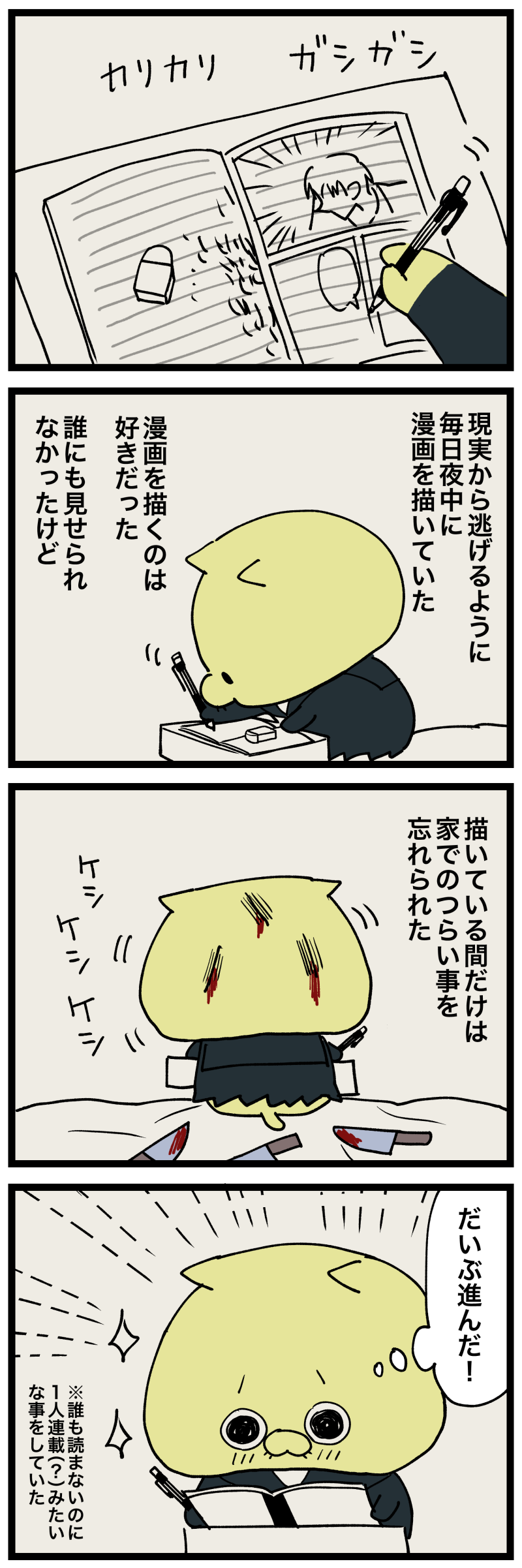 毒家族 母親と私㉞ -中学生編- 2024年03月22日 23:22 この頃描いてた漫画は誰にも見せられなかったから今こうやって皆に見てもらえる事反応もらえる事、す〜ごい幸せだと感じちゃうわね続わァ〜〜〜〜またこんな時間!みんなヨォ〜〜〜あの頃の私の代わりに傷ついたり怒ったり悲しんでくれてありがとうねえ…優しいね…優しさが沁みるわ…五臓六腑に染み渡るわおそらくこういう経験から常に相手の顔色を見ながらご機嫌をとる癖がついちゃったのよね過剰にやっちゃうのは良くないよね投票ボタンX( 旧Twitter )Instagram 「 - 毒家族 母親と私」カテゴリの最新記事 タグ :#毒親#毒家族#過去の話 < 前の記事次の記事 > コメント コメント一覧 (3) 1. 茂吉 2024年03月23日 09:19 めとうさんが楽しく(内容によっちゃあえげつないけど)ネットから発信してくれるのがめっちゃ嬉しいからウィンウィンと言っても差し支えはないかと(ᵔᴥᵔ) それにしてもこの展開、嫌な予感すぎる 隠れオタク歴のある人はみんな感じてるはず… 0 めとう がしました 2. チップママ 2024年03月23日 10:59 一生懸命描いてる横顔めとうさん可愛い🩷 今のめとうさんの漫画が大好きだから、昔の若い感性でひとり描いてた漫画も見たくなりました。 最後の一コマの母上が怖いよぉ… 0 めとう がしました 3. ななし 2024年03月23日 19:28 「誰も読まないのに」だとしても やり続けていく事が何より大切ですし やり遂げた!って達成感と自己肯定にも繋がりますからね🫠 私も小中学生時代はよく絵を描いて友達と交換したりしてたの思い出しました D2……いのまたさん……😭 今はもう絵がかけませんけど、いじめやDVに何とか耐え忍ぶ事が出来たのは当時イラストが大好きだったからです!💪 0 めとう がしました コメントフォーム 名前 コメント 記事の評価 リセット リセット 顔 星 情報を記憶 コメントを投稿する