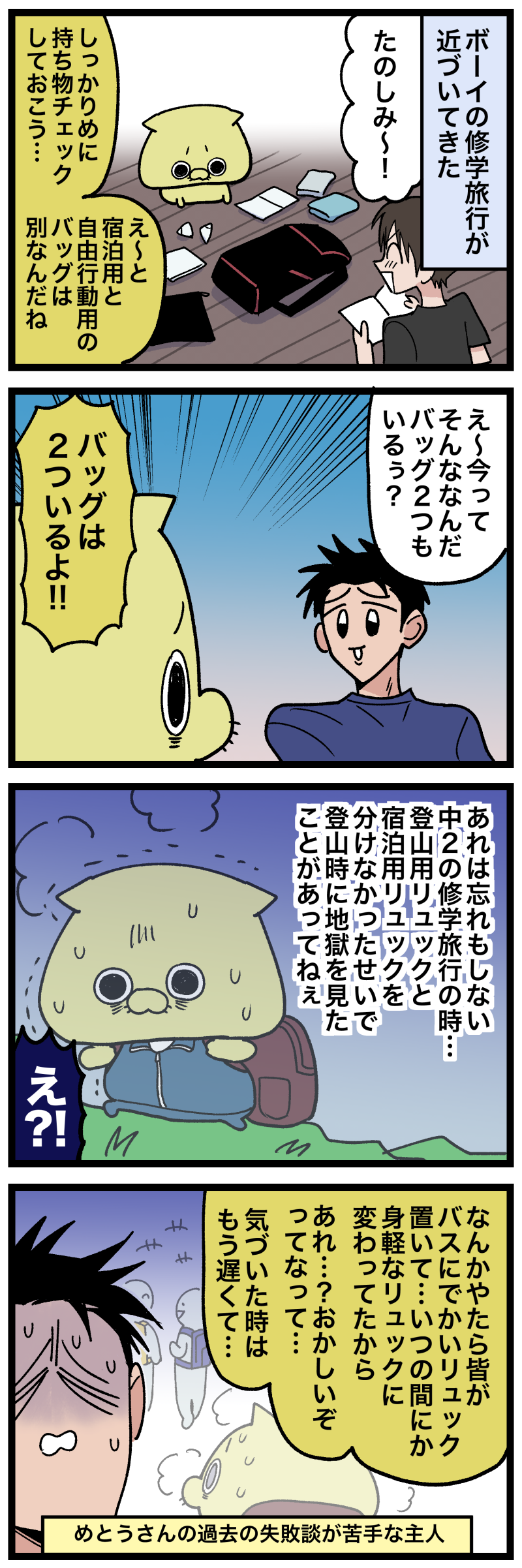 ボーイの修学旅行① -事前準備- 2024年06月21日 23:02 今思い返してもしっかりとダサい帽子だった…シンプルに貧乏だったのもあるそして本当に先生の話聞いてなかった前半は綺麗な自業自得コメ返!!ありがとうねえ!!!!!私のクズっぷりを見てもなおまだ励ましてくれる人おる…優しっ!!!!!!!あの家の人間は総じて余裕がなかったどこで間違えたんだろうなあ言ったっけ?4人とも全員が小学生だった頃はめっちゃ仲良しで楽しい兄弟だったよ弟のことも大好きだったけどもう戻れない負の連鎖を断ち切ることが私の使命だって!かっこいい!!!そうだね…がんばるぞ ありがとう投票ボタンX( 旧Twitter )Instagram 「 - ボーイの修学旅行」カテゴリの最新記事 タグ :#小学校#学校行事#ボーイ < 前の記事次の記事 > コメント コメント一覧 (3) 1. チップママ 2024年06月21日 23:22 笑っちゃうとともに、ご主人と同じ心境になったじゃないかぁ〜😂 過去のめとうさんに、オシャレな帽子とリュック持ってってあげたい!ノースフェイスとかの! 過去だからadidasとか??なんでもいいからオシャレなのをッ💦 0 めとう がしました 2. ホイホイっ 2024年06月22日 07:00 分かるな〜。 うちの母は、外見より、教養を!心を育てる!派だったので(宗教もやってました) 外見にはお金をかけず。あるものでいいでしょ!でした。 確かにSDGSなんだけど、やっぱ見た目って思春期はいろいろ左右するからあ… 反動で、自分の子どもたちには、新しい帽子やリュック買っちゃうなあ(やっぱ時代はノースフェイスなのか?みたいな) おしゃれな親子は常日頃からおしゃれなんだけどね! こう、意識して買っちゃうところが…笑 0 めとう がしました 3. あんこ 2024年06月22日 21:40 大丈夫です!大人になっても人の話きかないわたしです! 会社でなんか講習会?みたいなのを近くのホール借りてやるから、スーツ着てこいって言われたのにミッキーのTシャツとジーパンで行きましたから!大丈夫です! 周りのひそひそ声が痛かったですねぇ。 0 めとう がしました コメントフォーム 名前 コメント 記事の評価 リセット リセット 顔 星 情報を記憶 コメントを投稿する