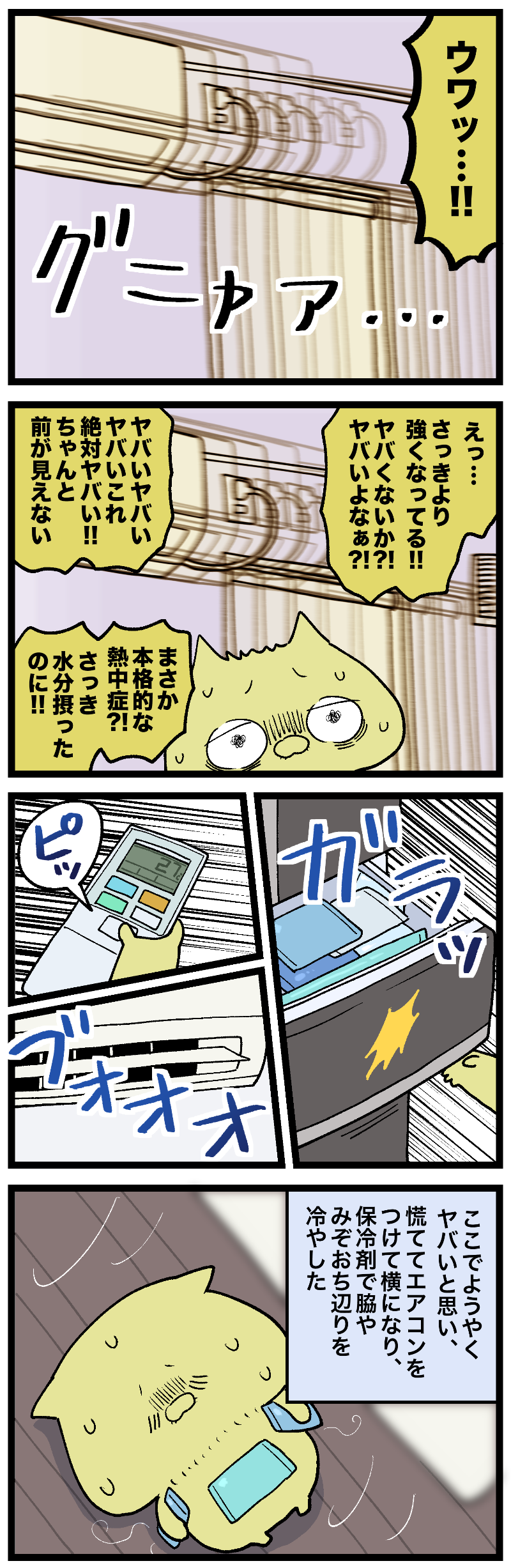 救急車に運ばれた話② 2025年07月06日 23:24 続 ⚠️現在スマホのみ下部にアンカー広告が出てしまっています。私の方でも調べてるんですが何をどうやっても消せない状況です。漫画が見づらい上にセンシティブな内容が多くてさぞ不快だと思います。ご迷惑おかけしてすみません。PCから閲覧いただくと解消されます。このブログが今よりもっとビッグになれば消せる部分だと思うのでもっと頑張ります。今後とも応援よろしくお願いします。🙇投票ボタン 最初から一気読みしたい人向けAmazon Kindle無料だよ! 週予定表グッズSHOPX( 旧Twitter )Instagram 「⚫︎事件」カテゴリの最新記事 < 前の記事次の記事 > コメント コメント一覧 (1) 1. うん 2025年07月07日 07:49 体温調節機能の低下や脱水による脳への血流不足が原因で強制終了しようとして眠くなる。 そして人間の体の自然治癒力は想像以上に優秀なので水分とって眠ることで回復します。 けいれんや体温が39度を超えたら病院へ。 0 めとう がしました コメントフォーム 名前 コメント 記事の評価 リセット リセット 顔 星 情報を記憶 コメントを投稿する