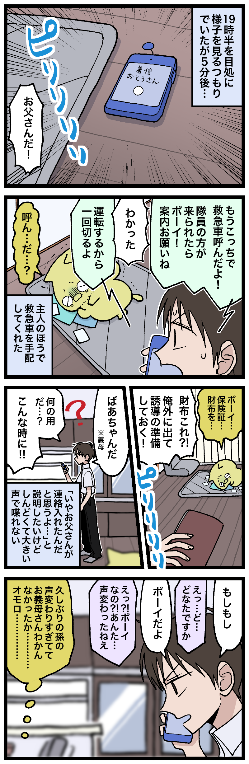 おばあちゃんが来る前に救急車が来て病院へ運ばれたら入れ違いになっちゃうから、ボーイ君は断ったんだと思いますよ。
