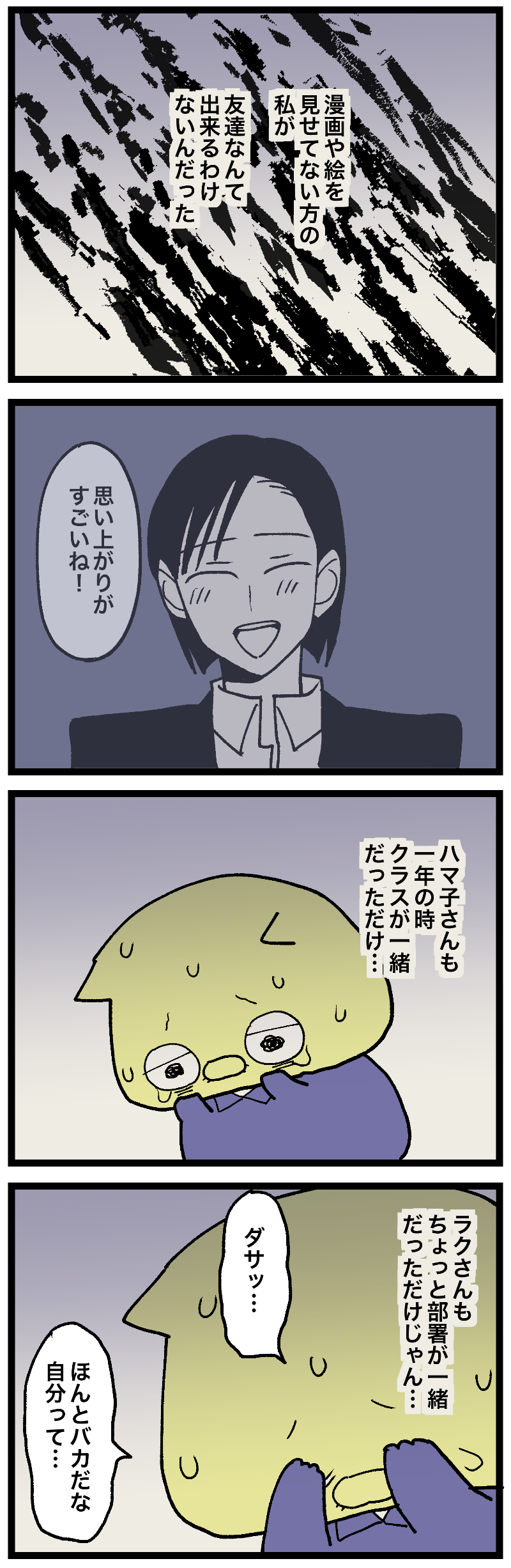 毒家族 母親と私364 -社会人編- 2025年10月29日 20:00 続⚠️現在スマホのみ下部にアンカー広告が出てしまっています。私の方でも調べてるんですが何をどうやっても消せない状況です。漫画が見づらい上にセンシティブな内容が多くてさぞ不快だと思います。ご迷惑おかけしてすみません。PCから閲覧いただくと解消されます。このブログが今よりもっとビッグになれば消せる部分だと思うのでもっと頑張ります。今後とも応援よろしくお願いします。🙇投票ボタン 最初から一気読みしたい人向けAmazon Kindle無料だよ! 週予定表 「 - 毒家族 母親と私」カテゴリの最新記事 < 前の記事次の記事 > コメント コメント一覧 (6) 1. 気にしないで! 2025年10月29日 22:00 職場の人は1人呼ぶとあの人もこの人も呼ばないと…となるからあまり呼ばないと思います。気にしないで―!! 呼ばないと角が立つようなタイプの上司がいたら呼ぶかもだけど。 0 めとう がしました 2. みいこ 2025年10月29日 22:49 ラクさん退職時にめとうさんに手紙くれたのはかわいくて大事な後輩だったからだと思うけどな。そうじゃなきゃわざわざ手紙書かないと思う。 上の方が書いてるように結婚式に職場の人をよぶのってきりがなくなるから難しいし。そんなにしょんぼりしなくて大丈夫。と当時のめとうさんに言いたい。 0 めとう がしました 3. ダックスネキ(おふぅとん) 2025年10月30日 07:51 俺じゃなきゃ見逃しちゃうね 0 めとう がしました 4. 本当かどうかもわからない 2025年10月30日 07:55 こんな幻想を抱いてしまうほど、自己肯定感が低くなっているってことだよなぁ 0 めとう がしました 5. くぅー! 2025年10月30日 08:35 不憫で抱きしめたくなる気持ちと、若者視点の世界ってこうだったなと懐かしく苦しくなる気持ちで、心がふたつある〜状態です。 人間関係や交友って白黒じゃないですよね。 若い頃思っていた親友や恋人とかって、全てを共有して自他の境界を限りなく無くしたような、ありえない関係のことだったような気がします。 今のめとうさんは当時の幼めとうさんに、あなたたちはちゃんと友達だったよと伝えられるんだろうなと思うので、安心して連載を読んでいます。 0 めとう がしました 6. めとうさん 2025年10月30日 13:28 あなたは大丈夫! 私はもうかなりのおばさんだけど、やはり若い時は人間関係に悩んで、悩んで、辛い思いもたくさんしました。 でも、今思うとなんで無理して付き合っていたんだろうとか、もう少し力を抜いてごらんと昔の自分に声をかけたい位です。 めとうさんは人一倍繊細で、優しくて、ときには向き合わしちゃう時もあるけど、でも、なんか応援したくなる。 0 めとう がしました コメントフォーム 名前 コメント 記事の評価 リセット リセット 顔 星 情報を記憶 コメントを投稿する